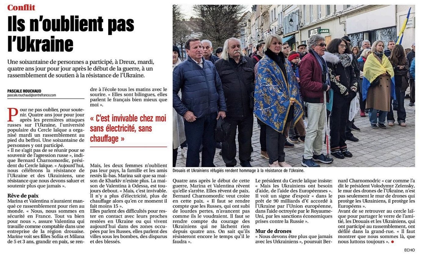 Une soixantaine de personnes a participé, à Dreux, mardi, quatre ans jour pour jour après le début de la guerre, à un rassemblement de soutien à la résistance de l'Ukraine.